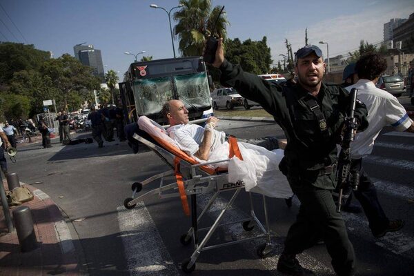 Israeli rescue workers and paramedics carry a wounded person from the site of a bombing in Tel Aviv, Israel. A bomb ripped through an Israeli bus near the nation's military headquarters in Tel Aviv on Wednesday, wounding several people, Israeli officials said. The blast came amid a weeklong Israeli offensive against Palestinian militants in Gaza that has killed more than 130 Palestinians.Oded Balilty/The Associated Press