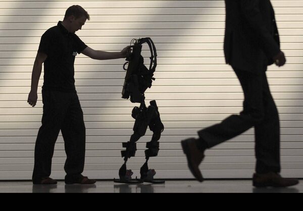 Engineer Thomas Dwyer stands with the new Bionic Exoskeleton as members of the public walk by during its launch at the Excel centre in London, England. The device is designed to aid wheelchair users and those who have suffered from spinal chord injuries to stand and walk.
