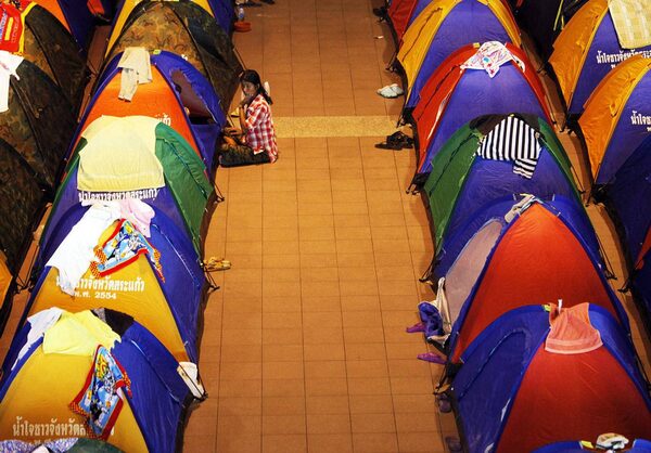 A woman, evacuated from an area affected by floods, sits near tents as she seeks shelter with thousands of others at a check-in hall that is not in use at Don Mueang airport in Bangkok.