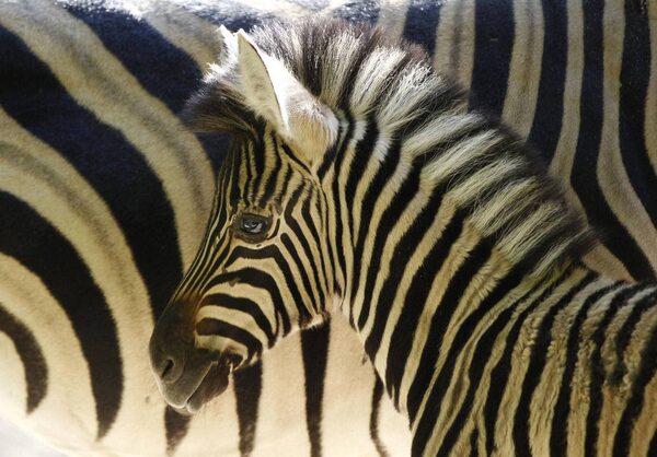 A young zebra that was born September 26th stands beside its mother at the zoo in Duisburg, Germany.
