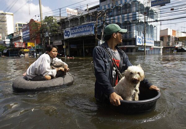 A Thai resident uses a makeshift float to keep his dog dry as he pulls a woman along flooded streets in Rangsit district on the outskirts of Bangkok, Thailand.