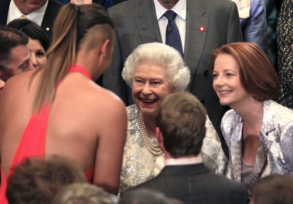 Queen Elizabeth II, second left, laughs with 6 ft 8 in tall Australian basketball star Liz Cambage, and Prime Minister Julia Gillard, right, at a reception at Parliament House in Canberra, Australia.