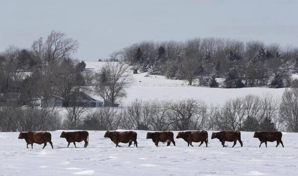 Cattle walk across a snow covered pasture on a farm near Lecomption, Kan., Wednesday, Feb. 5, 2014. The cattle were heading toward feed and shelter from the wind behind a nearby ridge.Orlin Wagner/The Associated Press
