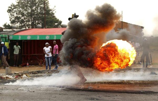 A protester swings a burning tyre as they take part in a service delivery protest in Sebokeng, south of Johannesburg, February 5, 2014.SIPHIWE SIBEKO/Reuters