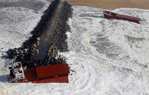 An aerial view show waves which break against a Spanish cargo ship carrying fertiliser, broken in two, off the beach in Anglet on the Atlantic Coast of France, February 5, 2014. A Spanish cargo ship carrying fertiliser broke in two on Wednesday after hitting a sea wall off the southwestern coast of France in high winds and was leaking some fuel into the water, French officials said.REGIS DUVIGNAU/Reuters