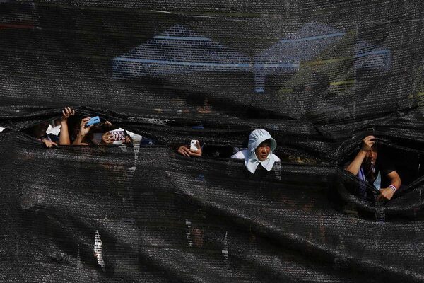 Anti-government protesters look out from gaps in a fabric partition at their camp near the Interior Ministry building, as police officers arrive to talk to them, in Bangkok February 5, 2014. Thailand's central bank warned on Wednesday of "substantially increased" risk to economic growth after the weekend's disrupted general election did nothing to restore stability in the politically polarised country.DAMIR SAGOLJ/Reuters
