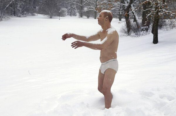 A statue of a man sleepwalking in his underpants is surrounded by snow on the campus of Wellesley College, in Wellesley, Mass., Wednesday, Feb. 5, 2014. The sculpture entitled "Sleepwalker" is part of an exhibit by sculptor Tony Matelli at the college's Davis Museum.Steven Senne/The Associated Press