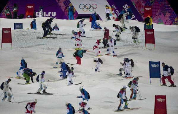 Moguls skiers take part in a course inspection prior to a training run at the Sochi Winter Olympics in Krasnaya Polyna, Russia, Wednesday, Feb. 5, 2014.Jonathan Hayward/The Canadian Press