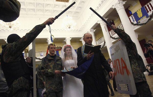 REFILE - CORRECTING GRAMMAR Ukrainian anti-government protesters Bogdan (2nd L), 21, and Yulia, 25, get married during their wedding ceremony in a city municipality building occupied by anti-government protesters in Kiev February 5, 2014.DAVID MDZINARISHVILI/Reuters