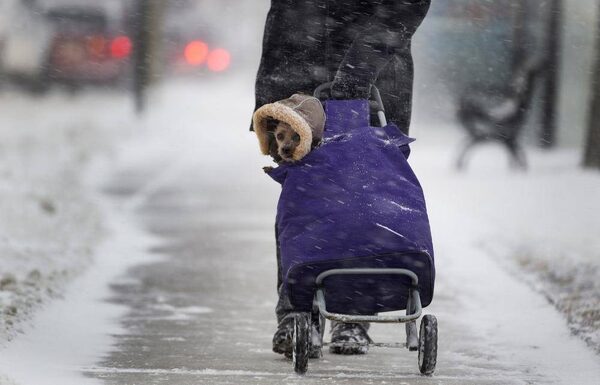 Stewart or "Pewey Stewey" as his owner John Williams fondly calls the two-year old rescued Yorkshire Terrier, gets a ride on the snowy weather in Hamilton, Ontario on Feb. 5, 2014. The snowfall is expected to continue until the late afternoon.Peter Power/The Globe and Mail