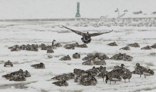 FLIGHT DELAYS - Canada geese huddle on ice pans on Bronte Creek and occasionally shake snow off their backs in Oakville, Ontario after an overnight snowfall on Feb. 5, 2014. The snowfall is expected to continue until the late afternoon.Peter Power/The Globe and Mail