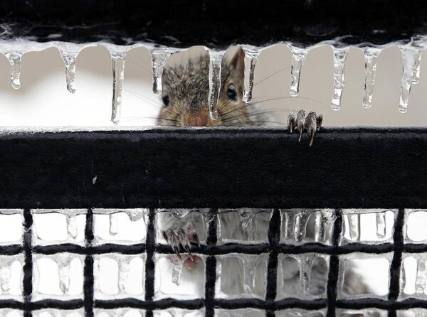 A squirrel peers through icicles Wednesday, Feb. 5, 2014, in Trenton, N.J. Temperatures around most of New Jersey are rising and the freezing rain that snarled much of the morning rush is ending.Mel Evans/The Associated Press