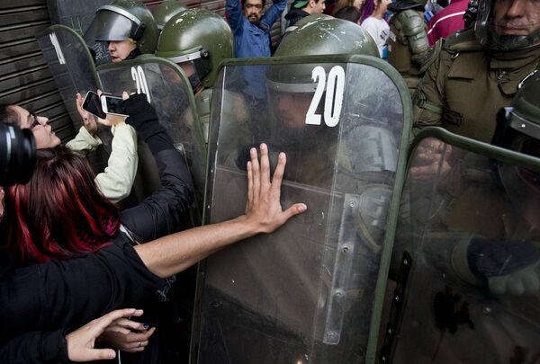 High school students confront police blocking their march for education reform in downtown Santiago, Chile.Esteban Felix/The Associated Press