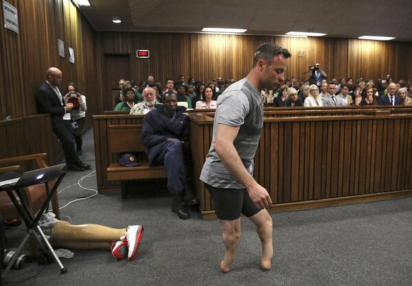 Oscar Pistorius removes his prosthetic legs and walks across the courtroom during his sentencing trial in the murder of his girlfriend, Reeva Steenkamp.Siphiwe Sibeko/The New York Times