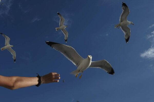 A woman feeds the sea gulls on a ferry boat on the Aegean sea between Keramoti, near Kavala city, and Thassos island in northern Greece.Petros Karadjias/The Associated Press