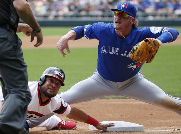 Toronto Blue Jays Josh Donaldson, right, reacts after tagging out Chicago White Sox's Melky Cabrera, bottom, during the second inning of a baseball game in Chicago.Nam Y. Huh/The Associated Press