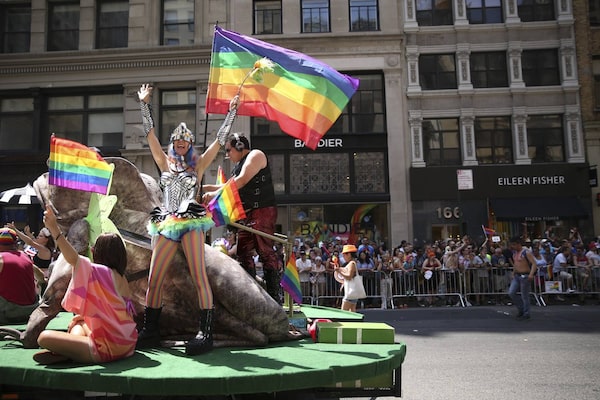 People in costume wave rainbow flags from a float during the 46th annual Gay Pride Parade in New York City.Damon Winter/The New York Times