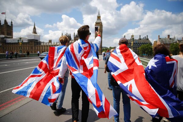 People walk over Westminster Bridge wrapped in Union flags, towards the Queen Elizabeth Tower (Big Ben) and The Houses of Parliament in central London.Odd Andersen/AFP / Getty Images