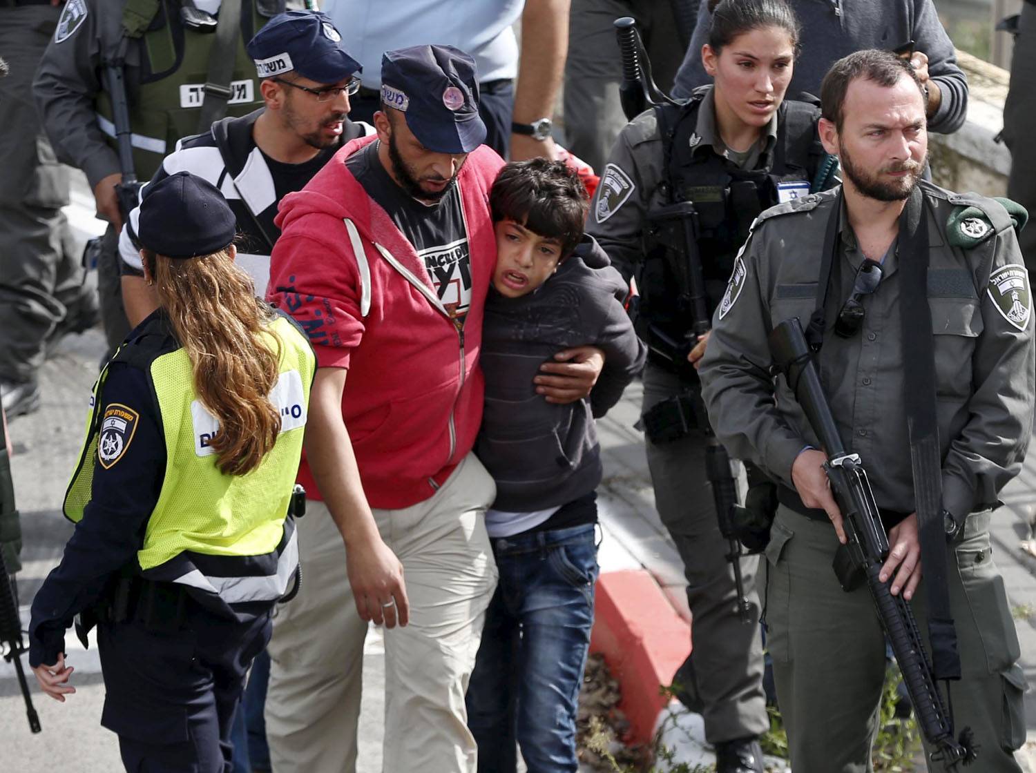 A Palestinian minor is detained by Israeli security after two Palestinians, aged 12 to 13, stabbed a security guard on a Jerusalem light-rail train.Ammar Awad/Reuters