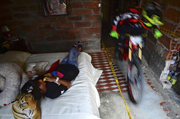 A downhill rider competes during the Adrenalina Urban Bike race in a shantytown in Medellin, Colombia.Raul Arboleda/AFP / Getty Images