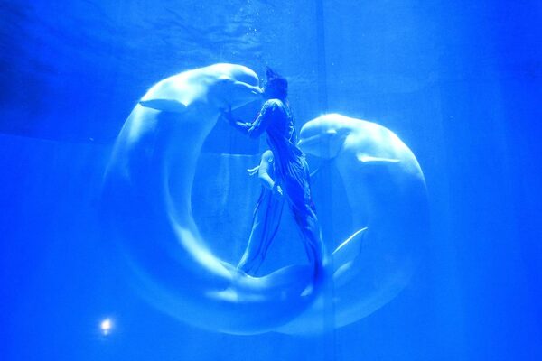 Beluga whales kiss their trainers during a performance at a aquarium in Harbin, Heilongjiang province, China.Reuters