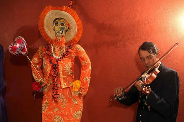 A musician plays his violin next to a depiction of La Santa Muerte (Saint Death) during Day of the Dead celebrations in Ciudad Juarez, Mexico.STRINGER/MEXICO/Reuters