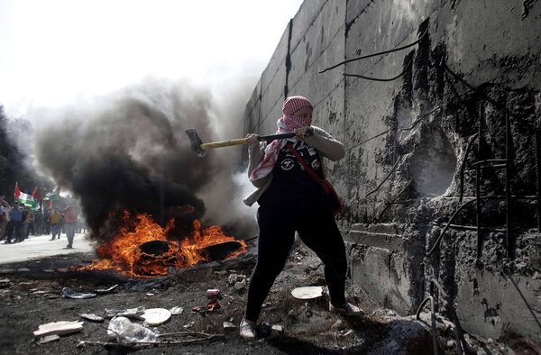 A female Palestinian demonstrator tries to hammer a hole in the Israeli-built wall separating the West Bank city of Abu Dis from east Jerusalem during ongoing clashes.Ahmad Gharabli/AFP / Getty Images