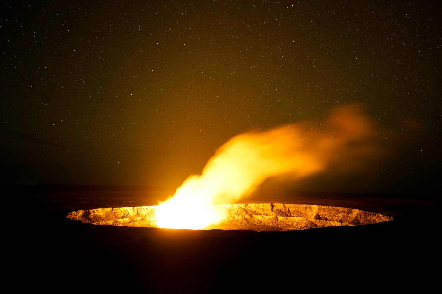 Smoke rises from the Kilauea Volcano caldera at night in Hawaii Volcanoes National Park in Hawaii, United States. The Kilauea Volcano has been erupting since 1983.Lucy Nicholson