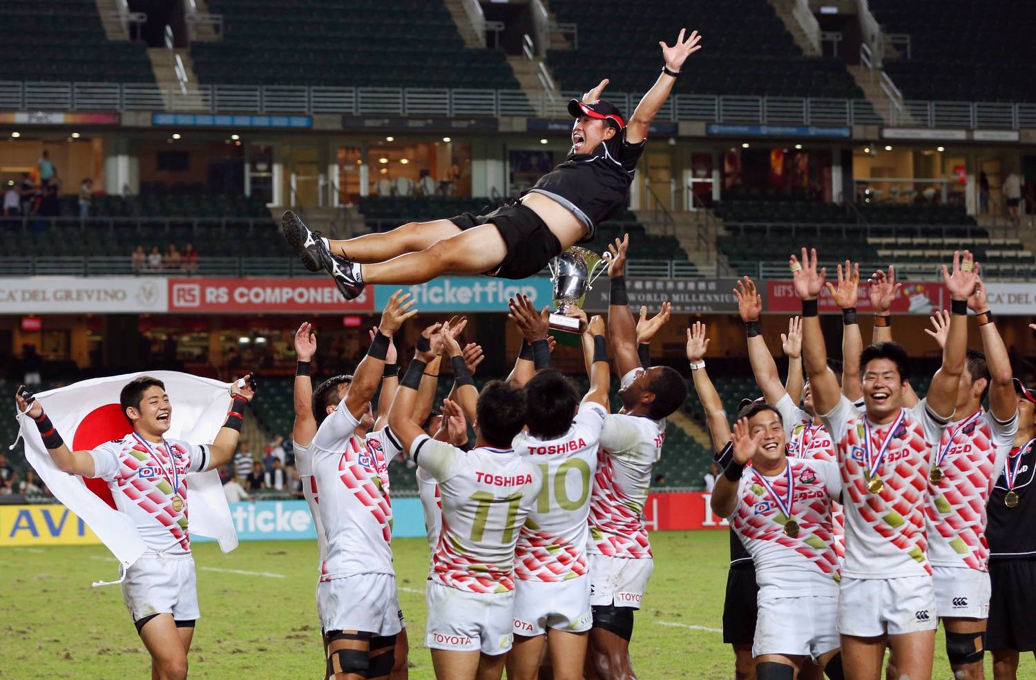 Japan's players celebrate with their teammate after beating Hong Kong in the final of the Asia Rugby Sevens qualifier, in Hong Kong, China.Bobby Yip/Reuters
