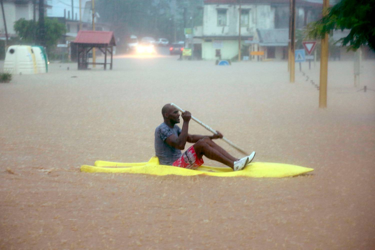 A man paddles through floodwaters in the village of Petit Bourg on the French Caribbean island of Martinique. Twenty-four hours after the torrential rains that fell on Martinique and flooding that ensued, the level of vigilance has been lowered.Jean Louis Saiz/AFP / Getty Images