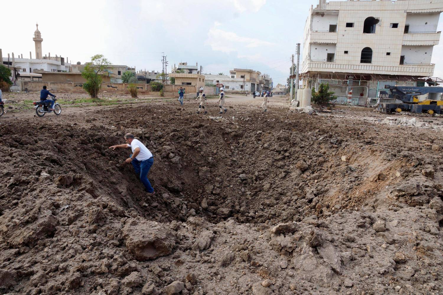 A man walks out of a crater caused by what activists said was a barrel bomb dropped by forces loyal to Syria's President Bashar Al-Assad in the town of Dael, north of Deraa, Syria.Alaa Al-Faqir/Reuters
