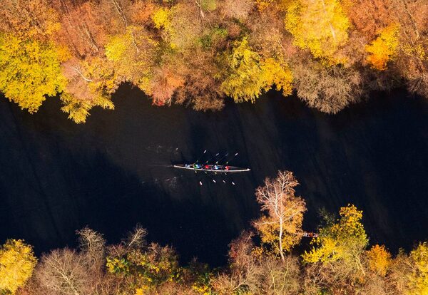 A rowing boat passes trees in autumnal colors on a water channel in Hamburg.Daniel Bockwoldt/AFP / Getty Images