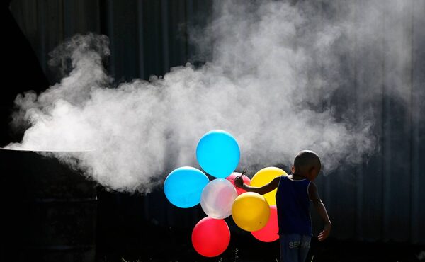 A Filipino boy plays with balloons beside a burning trash in Manila, Philippines.Aaron Favila/The Associated Press