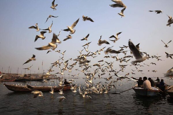 Seagulls fly around the boats at Sangam, the confluence of rivers Ganges and Yamuna, in Allahabad, India,Wednesday, Dec. 24, 2014. The migratory gulls arrive in the month of October and stay till the month of March.Rajesh Kumar Singh/The Associated Press