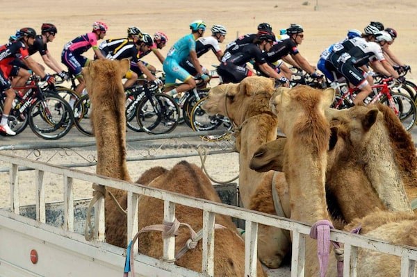The pack rides past a truck transporting camels during the fourth stage of the 2015 Tour of Qatar.Lionel Bonaventure/AFP / Getty Images