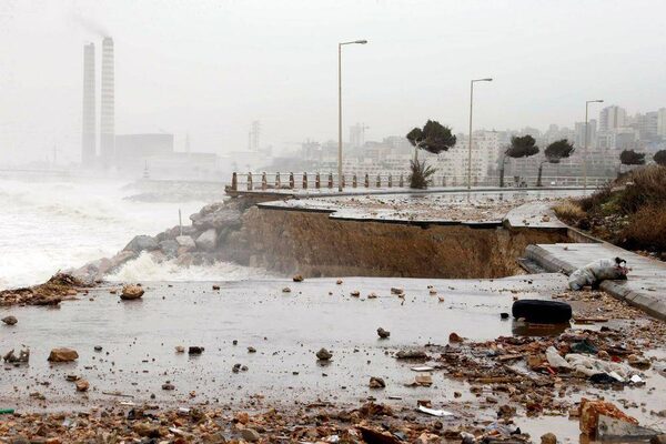 A road damaged by high waves is seen, as high winds sweep through Lebanon during a storm by the seaside in Dbayeh, north of Beirut .Mohamed Azakir/Reuters