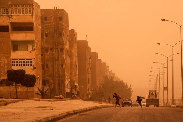Young students run to their homes during a sandstorm in 6 October city, a suburb southwest of Cairo, Egypt.Mosa'ab Elshamy/The Associated Press