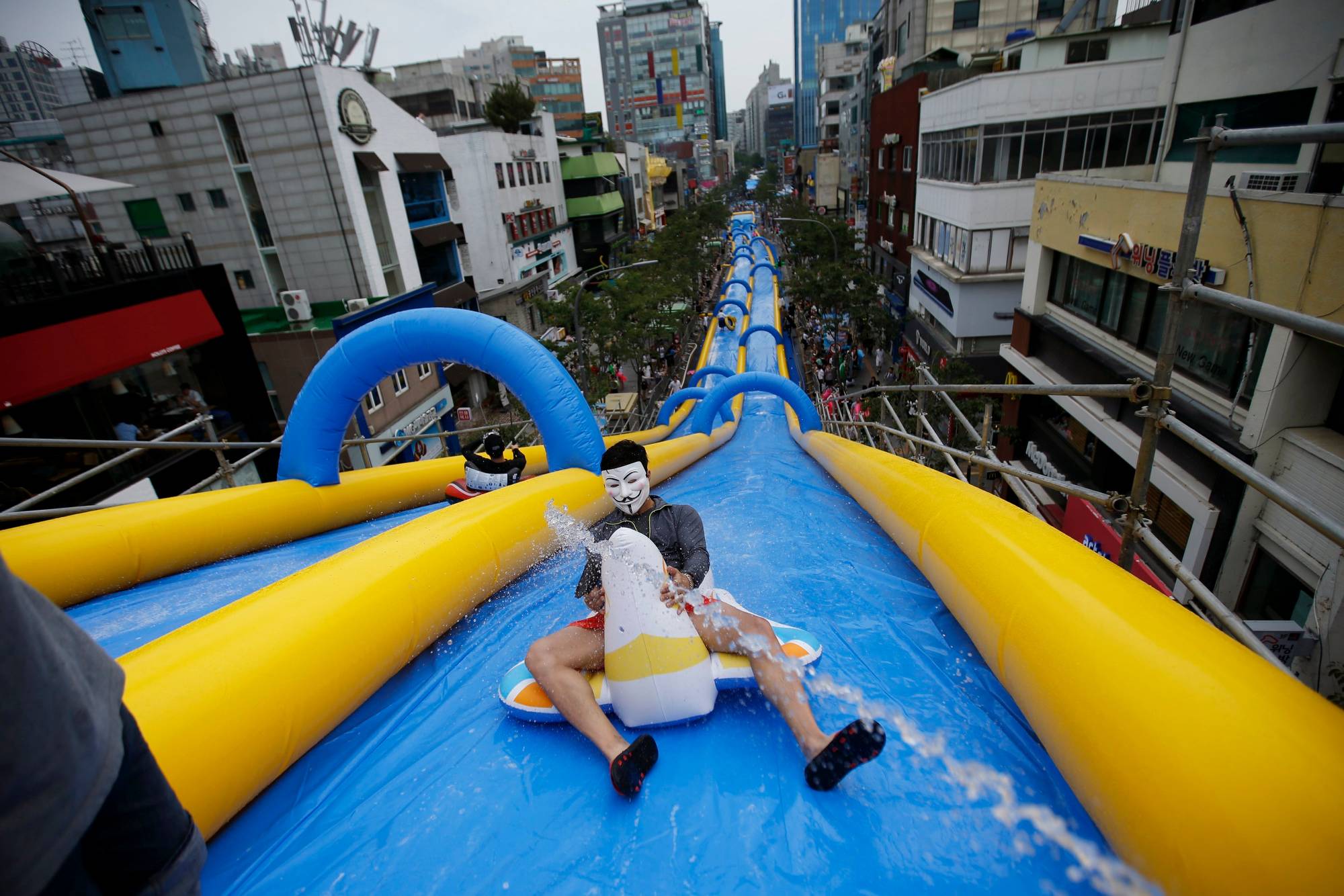 A man wearing a Guy Fawkes mask enjoys a ride on a 350-meter long water slide in central Seoul, South Korea.Kim Hong-Ji/Reuters