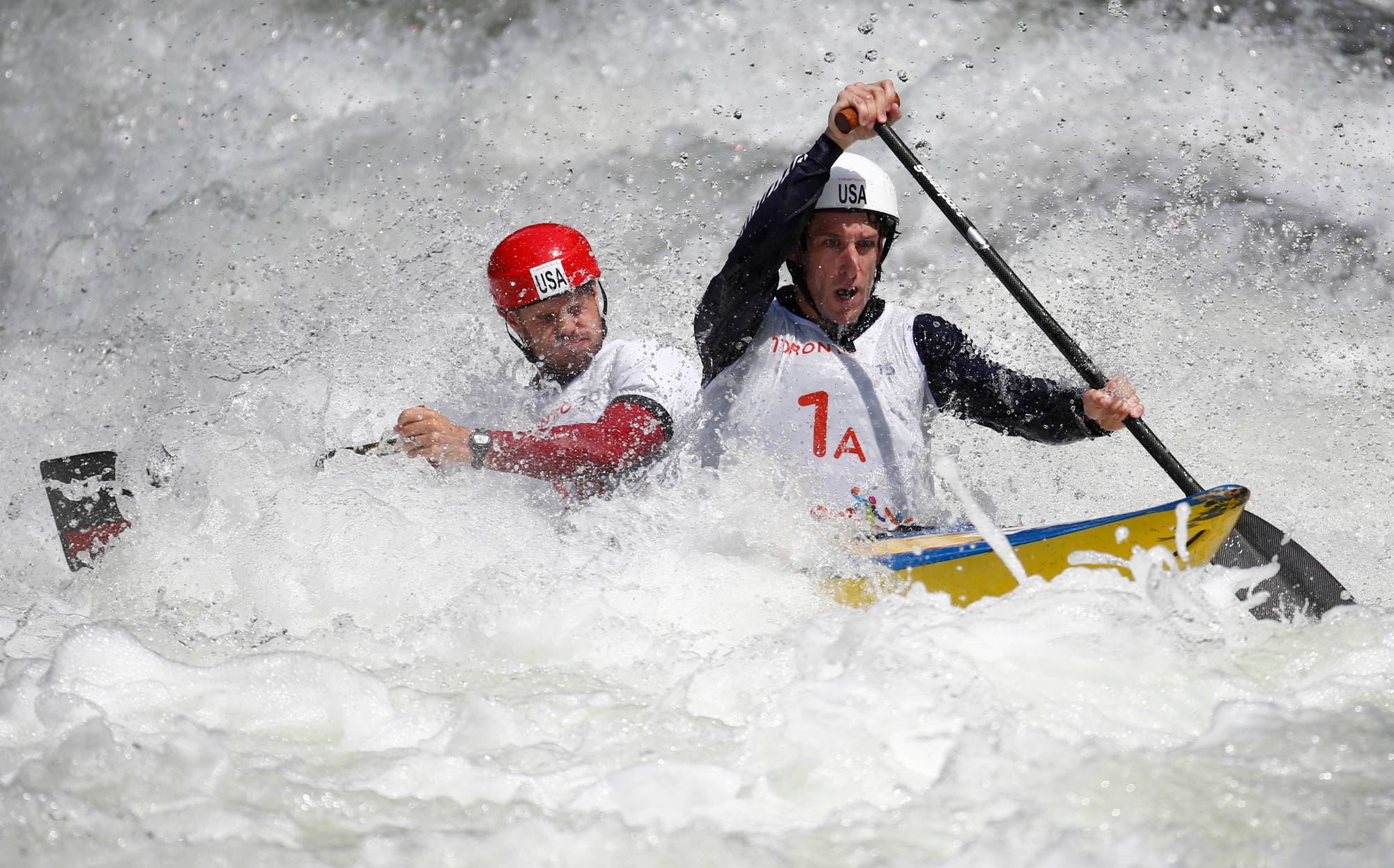 Devin McEwan and Casey Eichfeld of the United States compete in the men's canoe (C2) slalom semifinal during the 2015 Pan Am Games at Minden Wild Water Preserve.Jeffrey Swinger