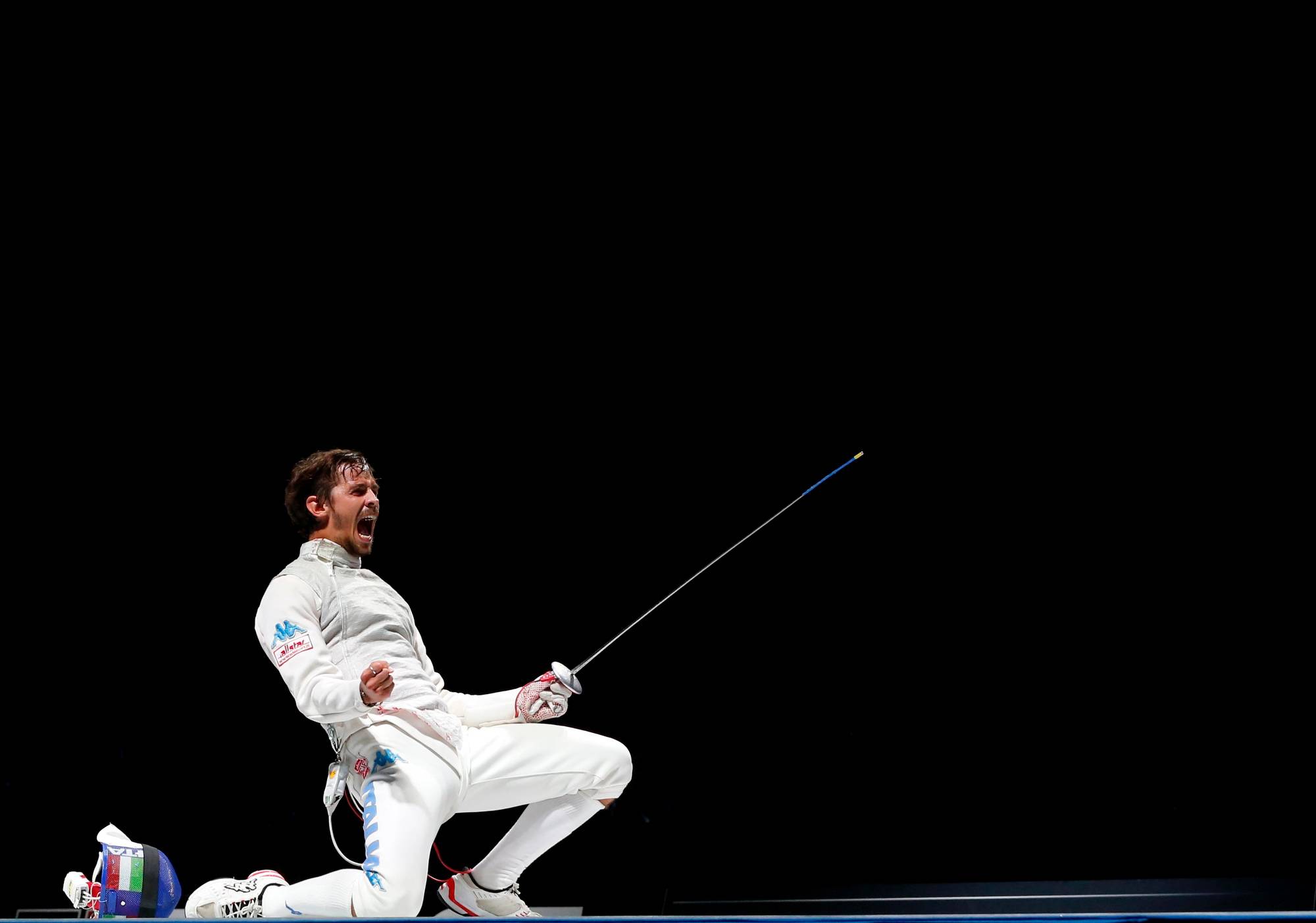 Italy's Andrea Baldini celebrates the victory over team Russia in the men's team foil final at the World Fencing Championships in Moscow, Russia.Grigory Dukor/Reuters