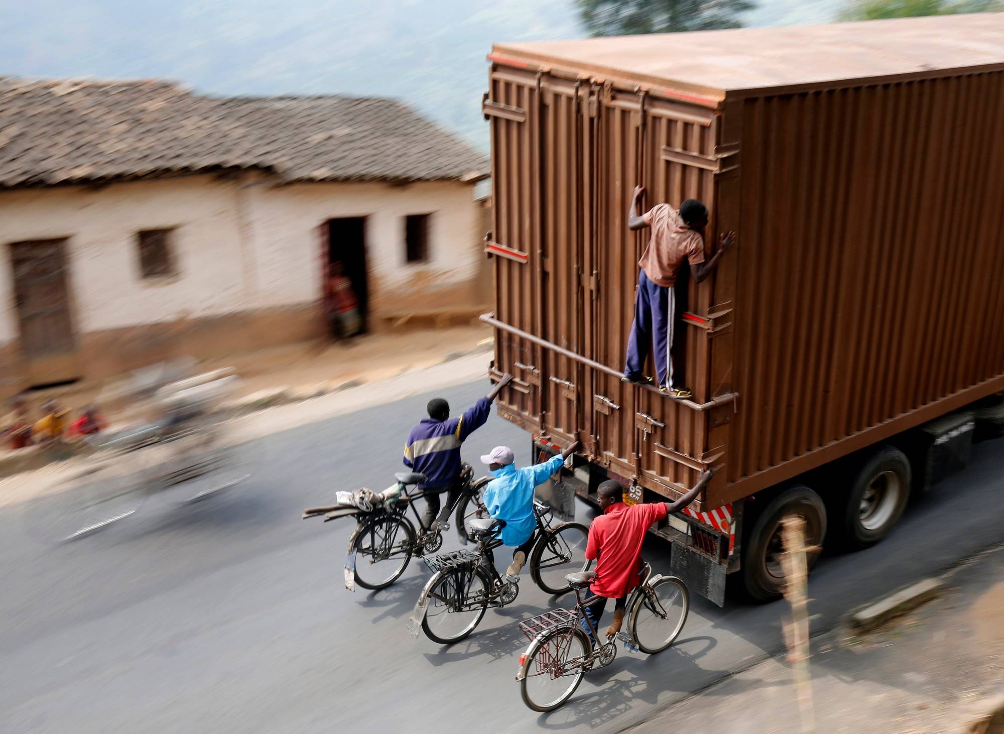 Cylists hang to the back of a truck outside Burundi's capital Bujumbura. Each day scores of cyclists make the 45 km downhill journey rom Bugarama to sell bananas, often hanging from the back of trucks for the return uphill trip.Mike Hutchings/Reuters