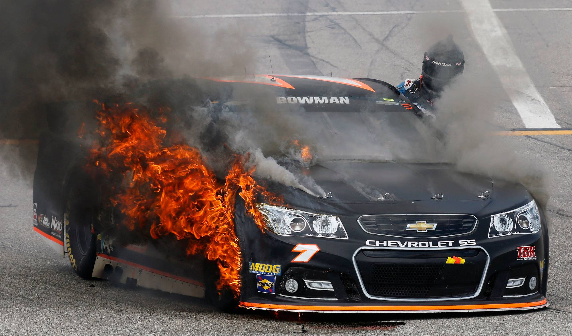 Alex Bowman climbs out of his burning car during the NASCAR Sprint Cup series auto race at New Hampshire Motor Speedway in Loudon, N.H.Jim Cole/The Associated Press