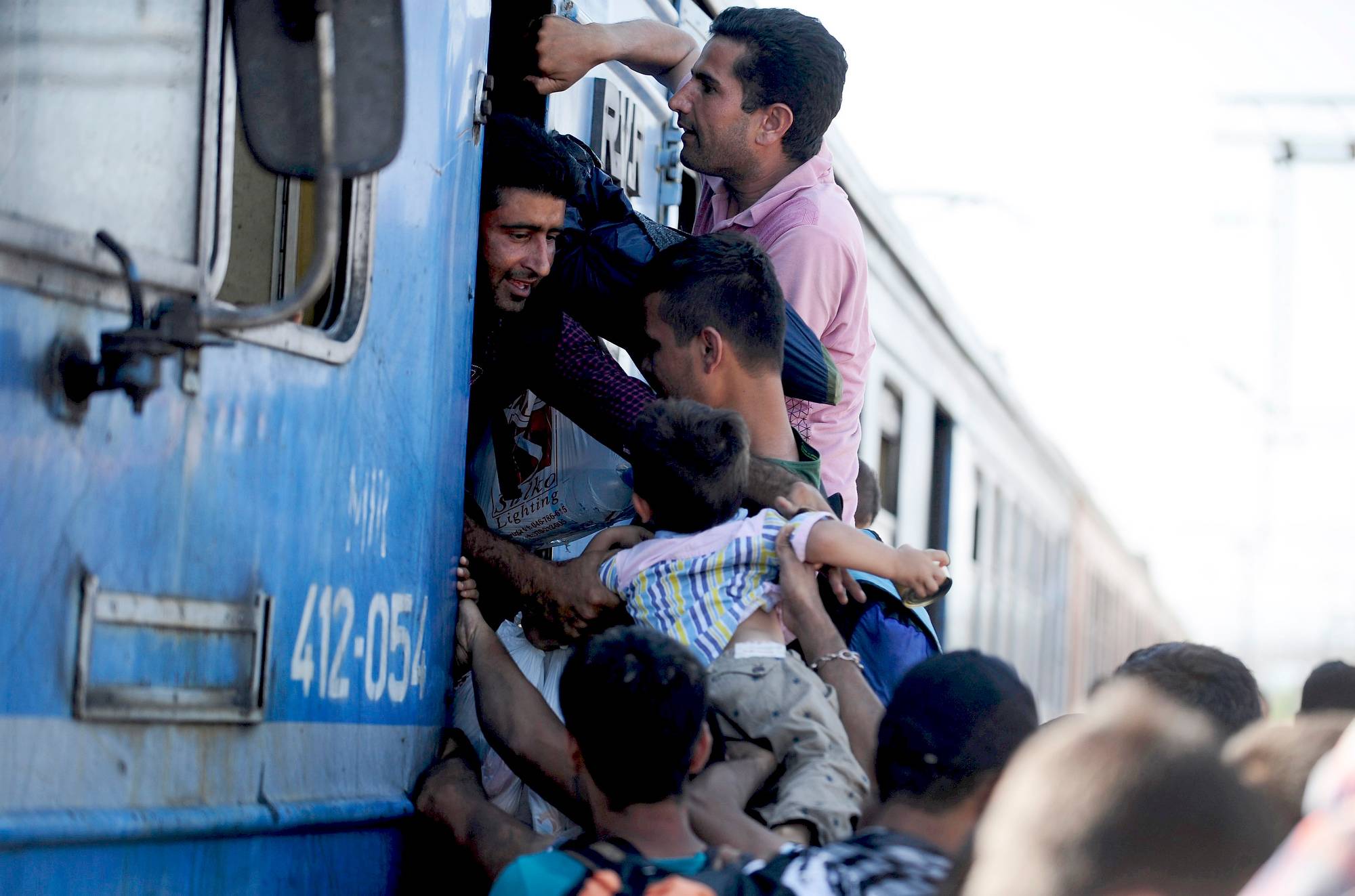 Migrants try to get onboard an overloaded train at Gevgelija train station in Macedonia, near the border with Greece, on their transit route to EuropeOgnen Teofilovski/Reuters