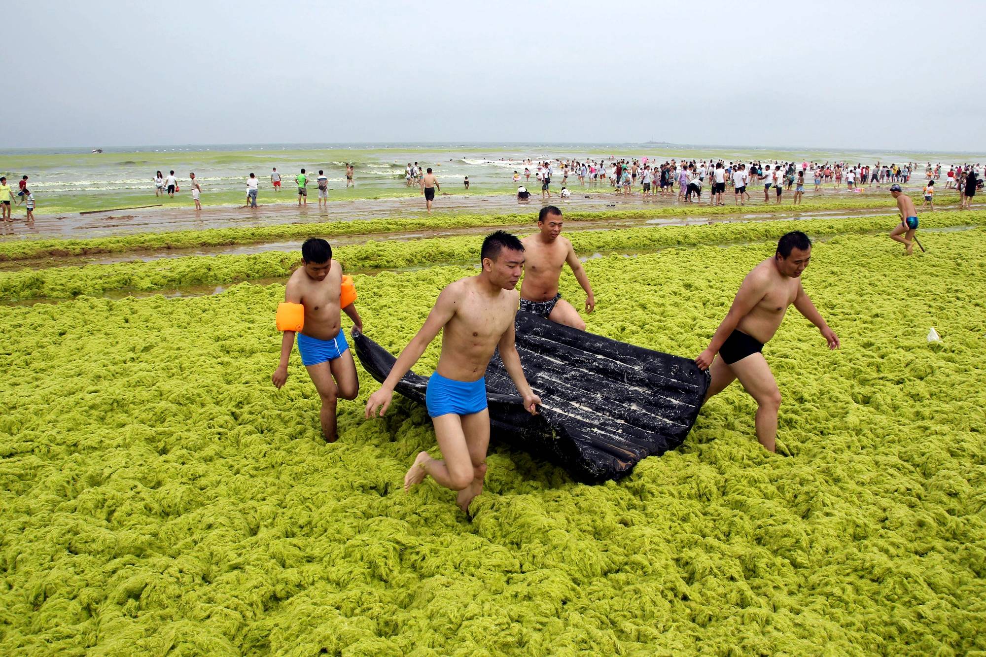 Swimmers make their way across an algae-covered beach in Qingdao, Shandong province, China.Reuters
