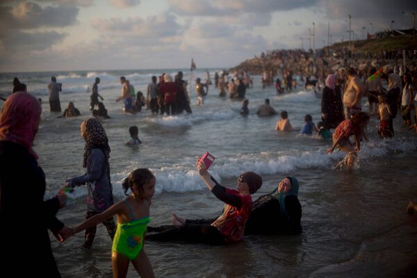 Palestinians, many of whom came from the West Bank, bathe in the Mediterranean Sea during the last day of the Eid al-Fitr holiday as the sun sets in Tel Aviv, Israel.Ariel Schalit/The Associated Press