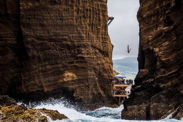 Jonathan Paredes of Mexico dives from the 27 metre platform during the fifth stop of the Red Bull Cliff Diving World Series at Islet Franco do Campo, Azores, Portugal.Rimona Amato/AFP / Getty Images