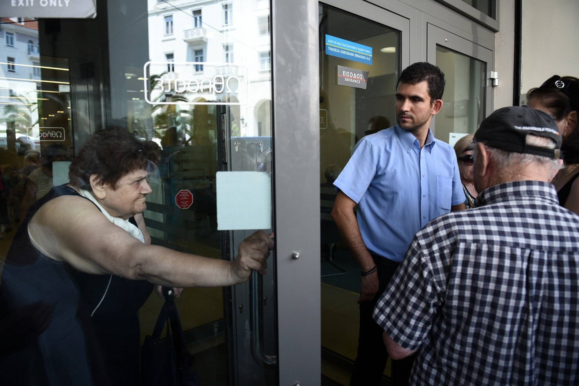 A pensioner exits from a bank as others wait to enter the branch for limited services in the northern Greek port city of Thessaloniki during Greece's financial crisis.Giannis Papanikos/The Associated Press
