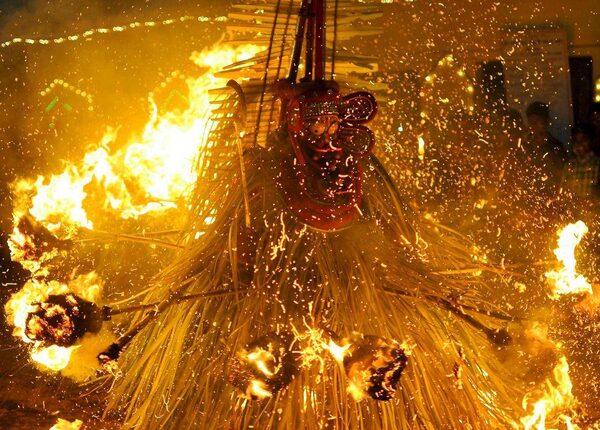 An artist dressed as Hindu god Kandakarnan performs a ceremonial dance with fire during the Theyyam ritual in Somwarpet town in the southern Indian state of Karnataka .Abhishek Chinnappa/Reuters