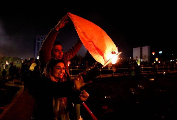 An Iranian couple take a selfie as they hold a lantern in a park in Tehran during Chaharshanbeh Soori, held annually on the last Wednesday eve before the Spring holiday of Noruz.Behrouz Mehri/AFP / Getty Images