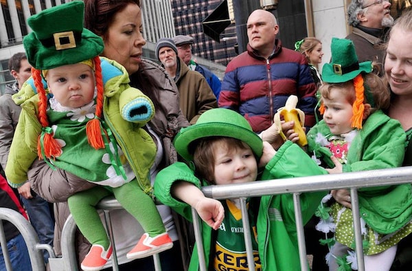 Auston O'Grady, 3, center, and his sisters Billie O'Grady, 7 months, right, and Zola O'Grady, 2, watch the St. Patrick's Day Parade in New York.Seth Wenig/The Associated Press